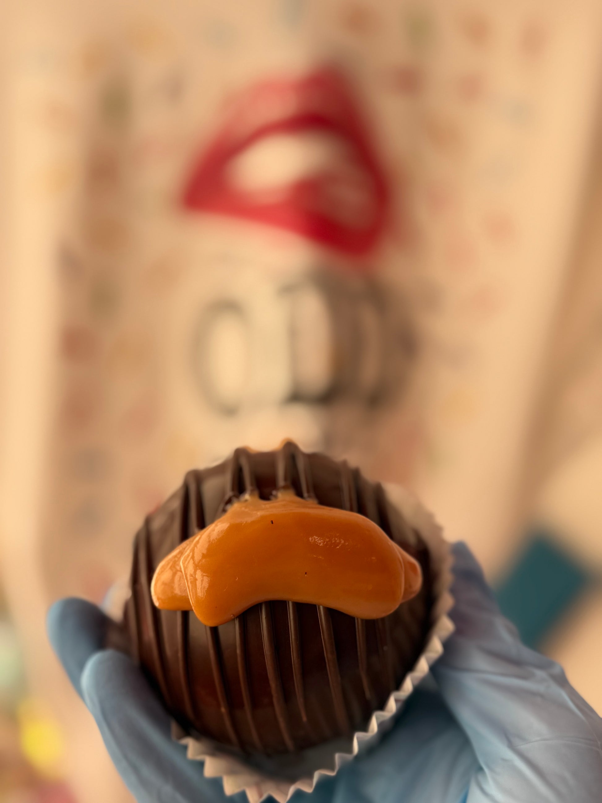 CHOCOLATE SHELL FILLED WITH HOT COCOA MIX, SALTED CARAMEL, AND MINI MARSHMALLOWS